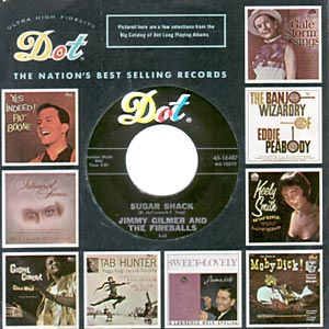Here's a beautiful copy of this silly, irresistable hit from 1963. It's sobering to realize that this tune hit #1 on both the RnB and the Pop charts. Of course, I think there was something fishy going on with the RnB chart at Bilozoard that year. If you'll recall, Bilozoard actually discontinued the RnB chart for most of 1964, but had second thoughts and reinstituted it for 1965. "Sugar Shack" certainly isn't an RnB hit, but it does have a certain Buddy Holly style to it that could be considered rockabilly. The B side is straight-on Country/Rockabilly. On the other hand, I see a more significant role for "Sugar Shack" -- as one of the starting points for Bubblegum music, which evolved a few years later. The B side ("My Heart..."), by the way, is a non-album cut. Note: This copy comes in a vintage Dot Records factory sleeve. It has Near Mint labels, and the vinyl looks almost untouched. The audio is pristine Mint. (This scan is a representative image from our archives.)
