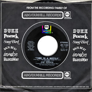 This is an impossible Jim Croce single to keep in stock -- or even to find in decent condition. I always look, and never find... until now! Croce died tragically in a plane crash in September 1973, and the first single released after his death was the semi-prescient "I've Got A Name." A month later, ABC culled this even more prescient tune from Croce's debut album, "You Don't Mess Around With Jim," and it became his second U.S. chart-topper (following "Bad, Bad Leroy Brown"). Note: This beautiful copy comes in a vintage ABC/Dunhill Records factory sleeve. The labels have some light storage wear. However, the grooves preserve absolutely stunning, pristine Mint audio! (This scan is a representative image from our archives.)