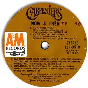 Here's a little slice of heaven for Carpenters fans: A Stereo EP of the duo singing 8 nuggets from the Rock'n'Roll era, culled from their album of the same name, which included the hit "Yesterday Once More." Some of the songs segue into each other, and you also get to hear Richard handle vocals on some of the tracks. The EP comes in a paper sleeve (see scan) and spins at 33 ⅓ RPM with a small spindle hole. Here's the track list:\r\n