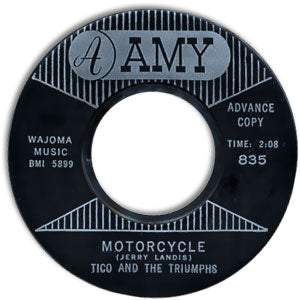 "Motorcycle" beautifully mines the burgeoning style of Rock that I refer to as "Surf/Cars" — songs celebrating the sun, sea, surf and fun together with songs glorifying and pining for various muscular vehicles. Both styles tended to feature electric lead guitar played in a tone and style that supposedly mimics the rhythms and shifting tones of ocean surf. Note: This beautiful promo copy has Mint labels, with no flaw worth noting, together with pristine Mint audio — nothing is missing; everything is crazy clear. The vinyl grades Near Mint, reflecting some very light storage wear and a faint warp hardly worth mentioning that has no effect on the audio. PS. In case you're wondering, in 1961 Amy had no factory sleeve for its 45 records; only its sister brand Mala did at that time; I believe Amy sleeves were only introduced in 1965.